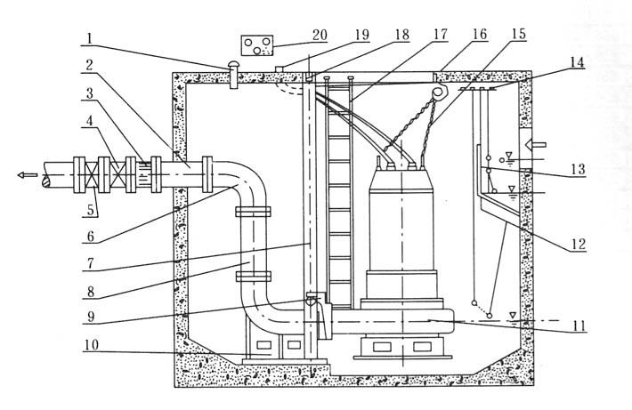1.通風節 2.預埋管 3.膨脹節 4.逆止閥 5.閘閥 6.彎管 7.導軌 8.出水管 9.支架 10.耦合底座 11.自動攪勻排污泵 12.浮球開關(水位開關)13.隔板 14.浮球固定架 15.小鏈 16.掛鉤 17.人梯 18.支撐架 19.電纜出線管 20.電機保護器